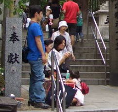 櫛田神社に訪れる人たちはベンチに座ってやきもちを食べてから櫛田さんへお参りします。